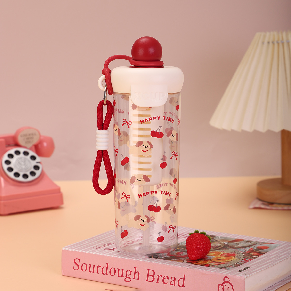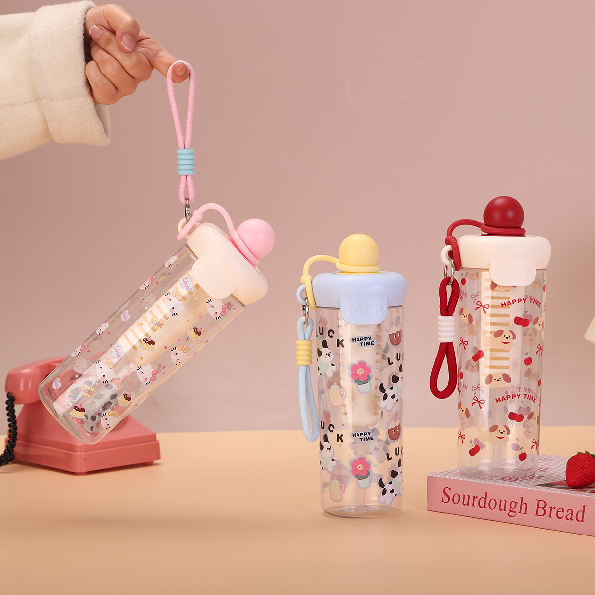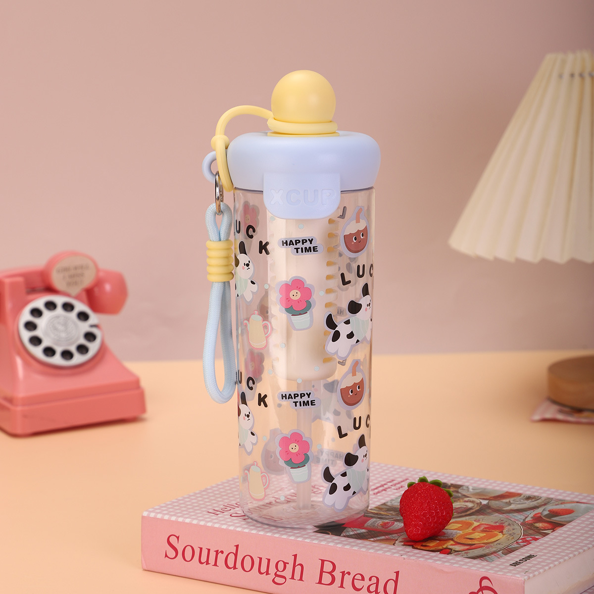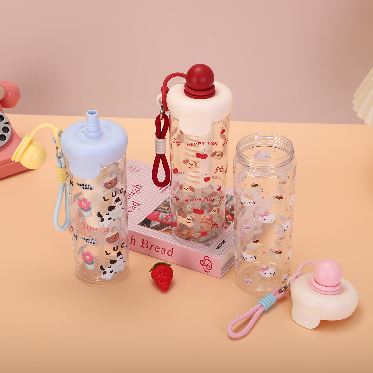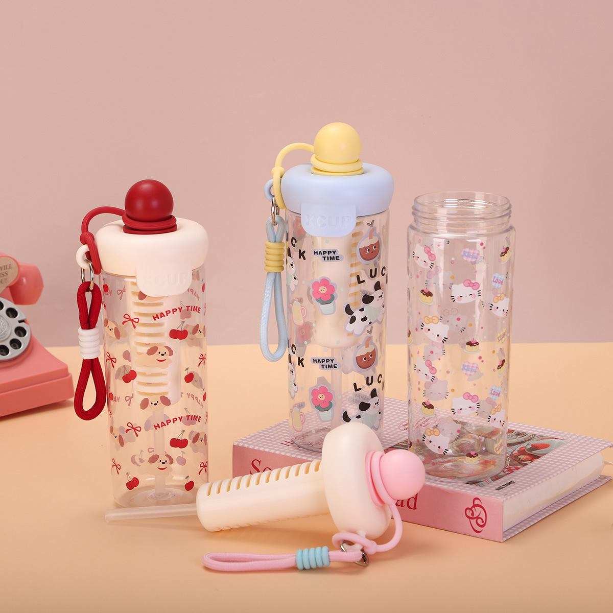 新款高颜值浮球塑料杯大容量便携吸管杯卡通带提绳茶水分离杯批发