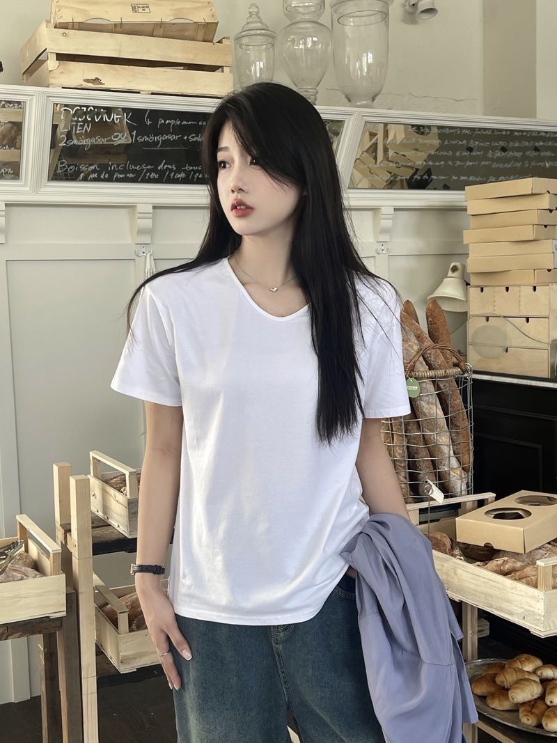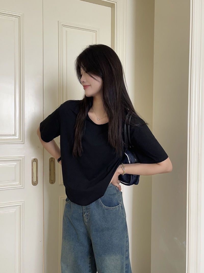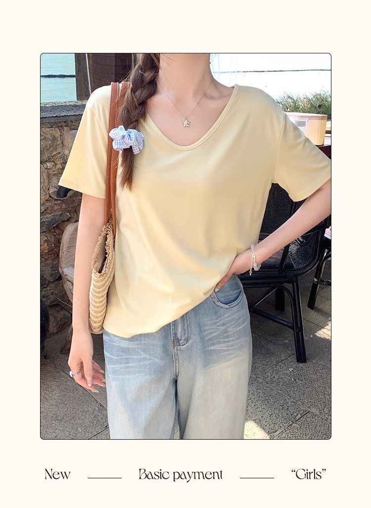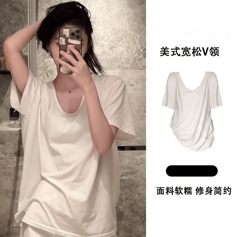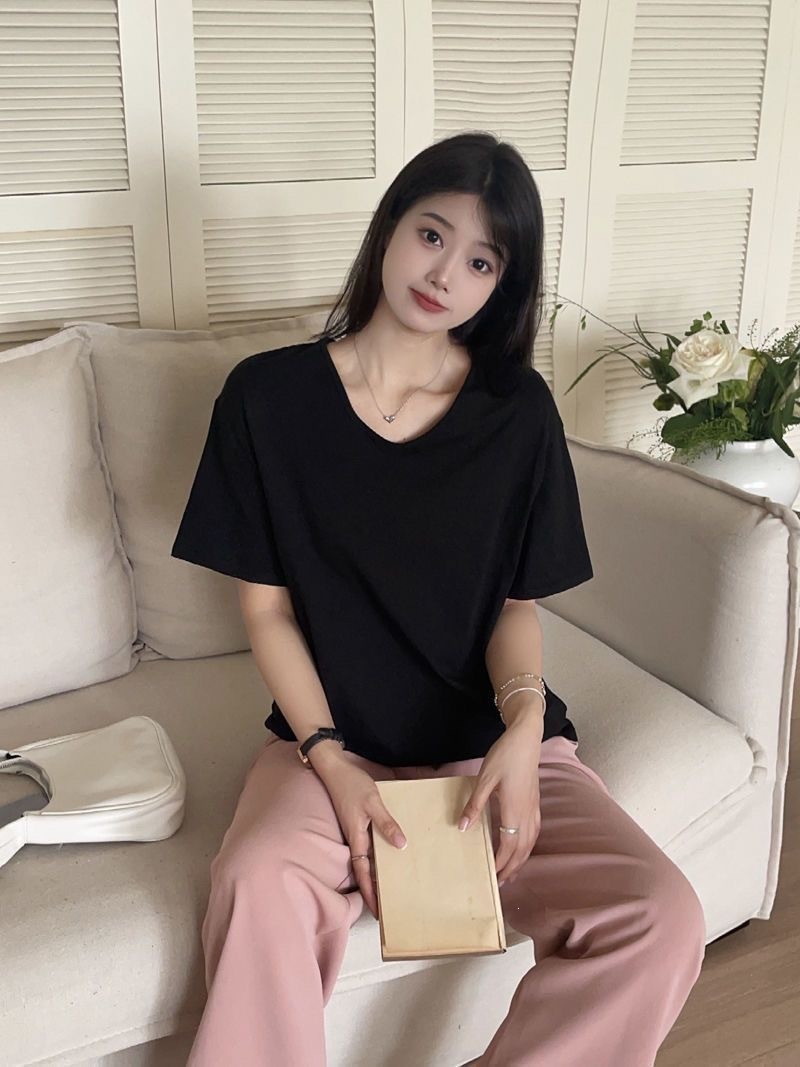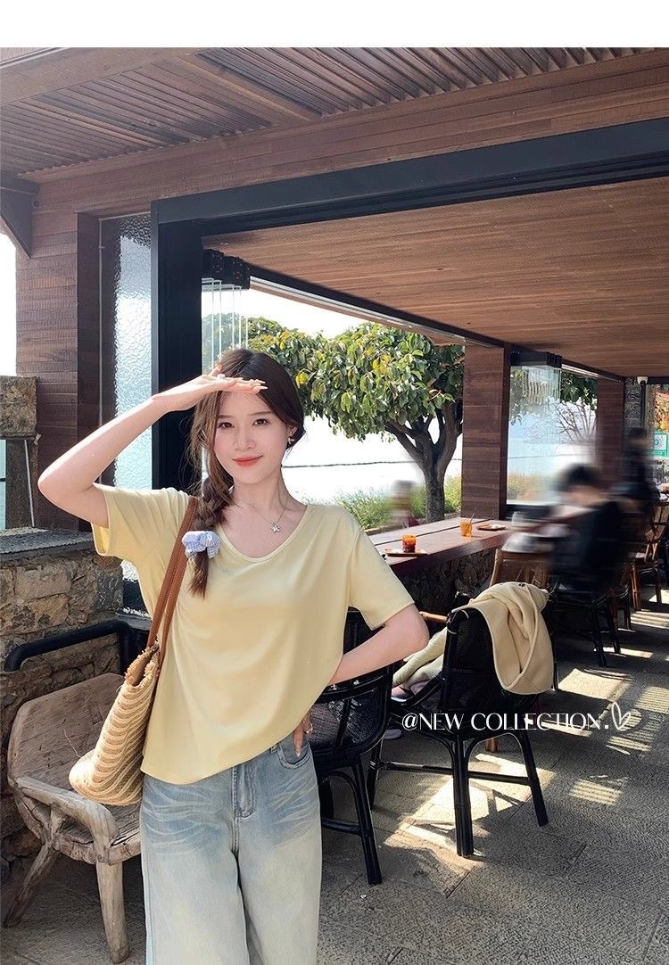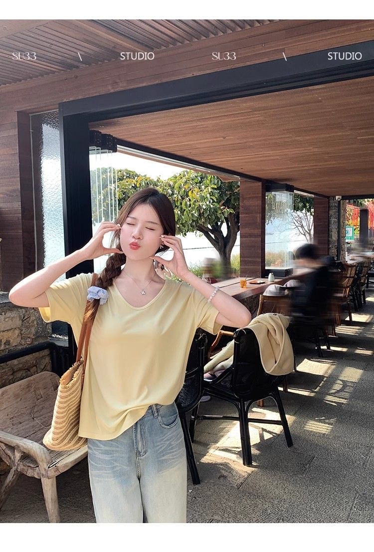 230克冰丝罗纹日系百搭韩版时尚宽松简约纯色v领短袖t恤上衣女潮