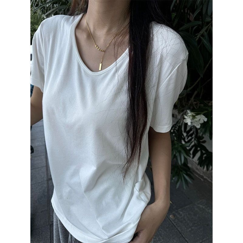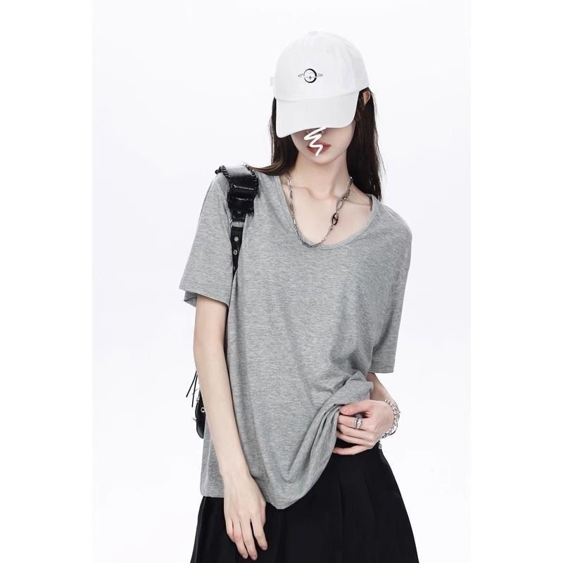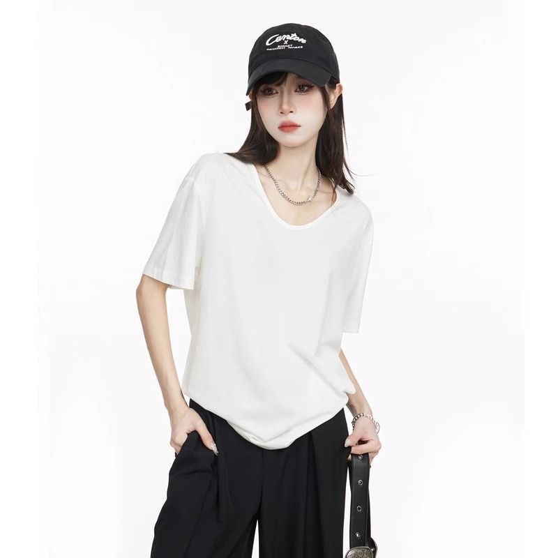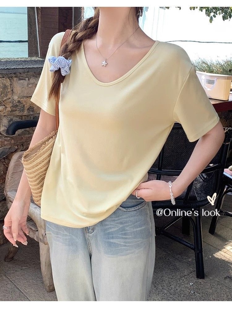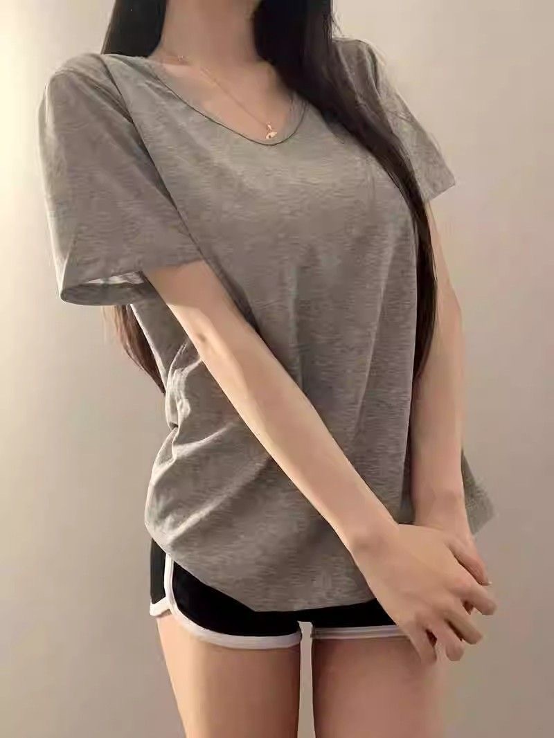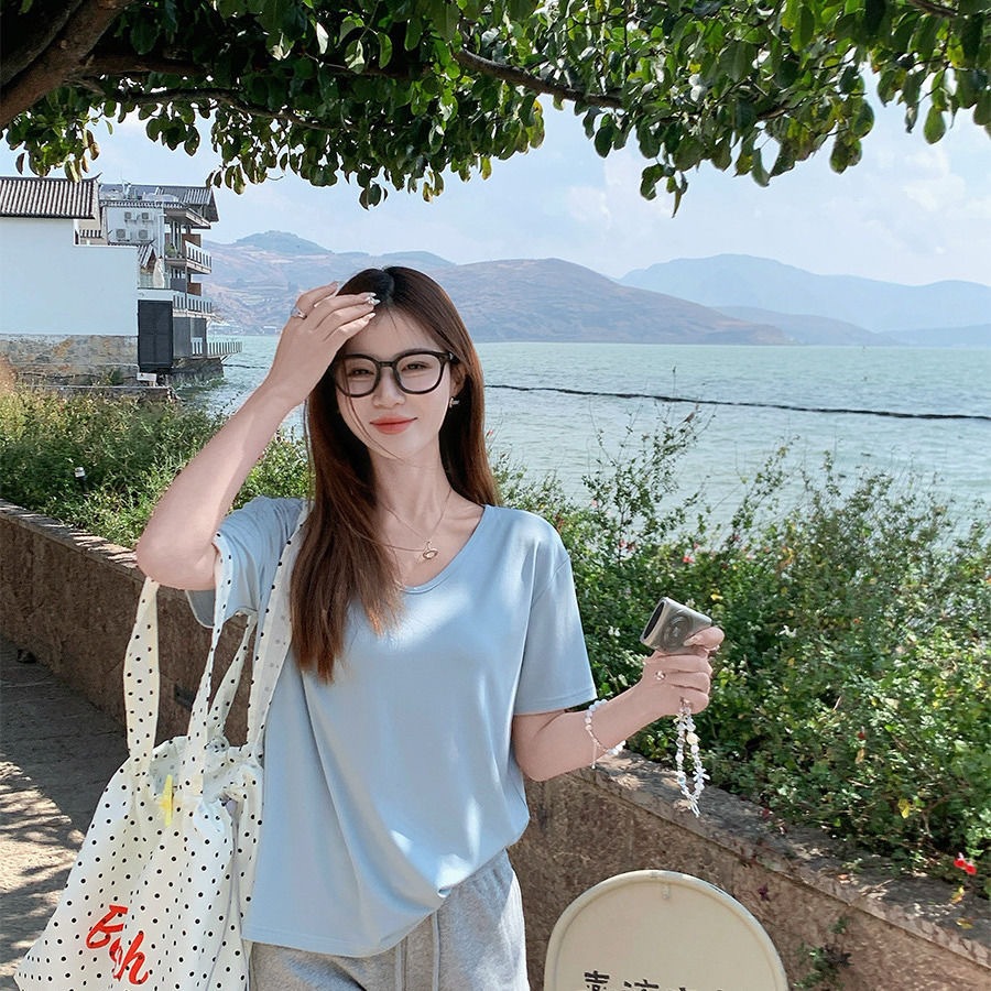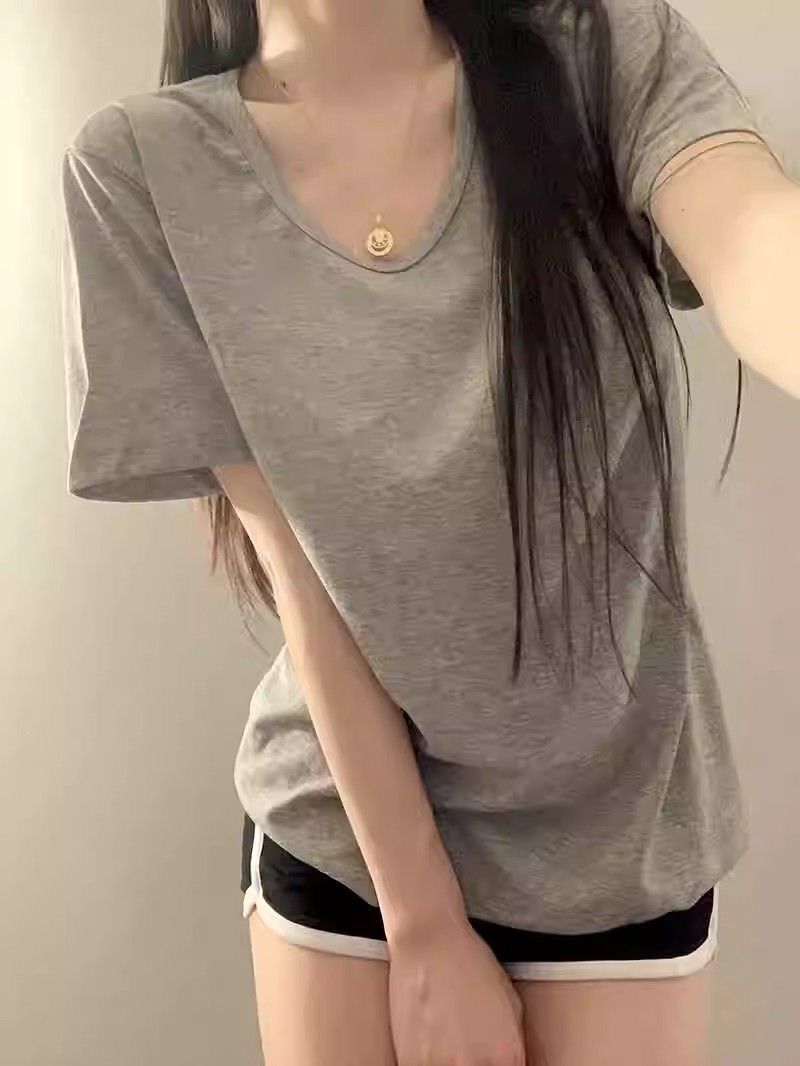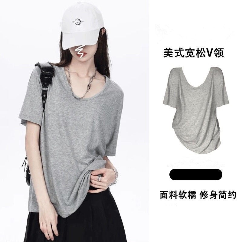 230克冰丝罗纹日系百搭韩版时尚宽松简约纯色v领短袖t恤上衣女潮