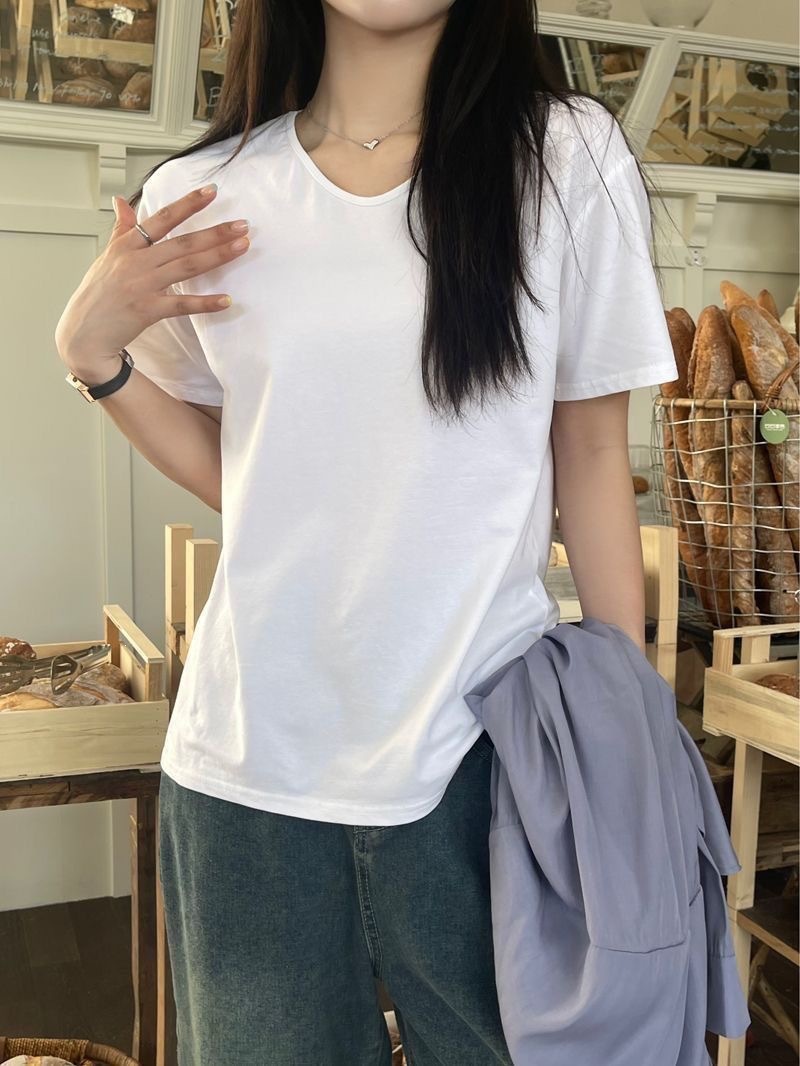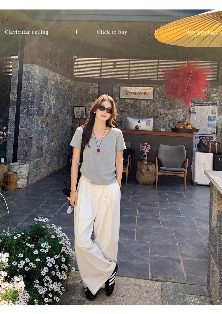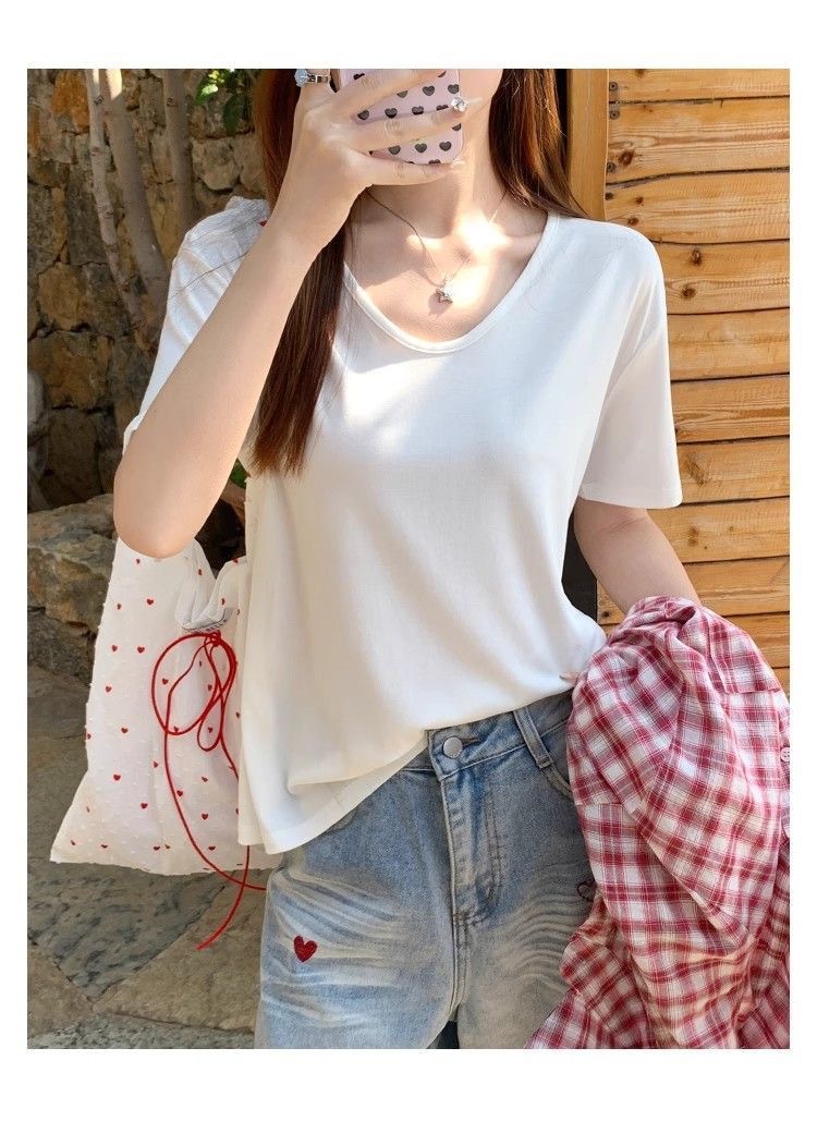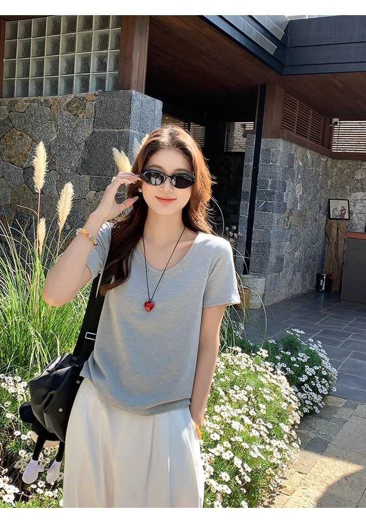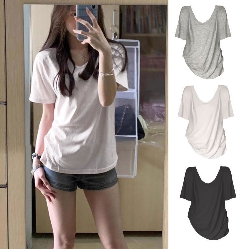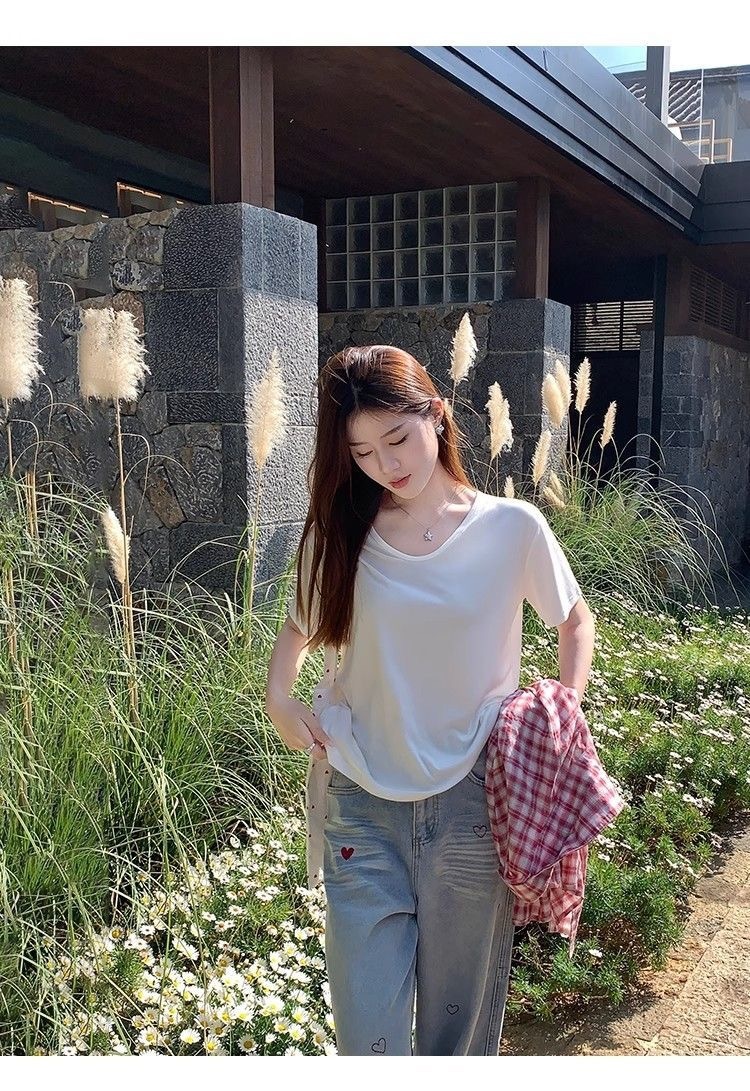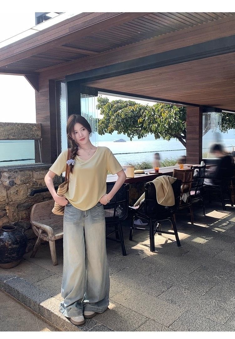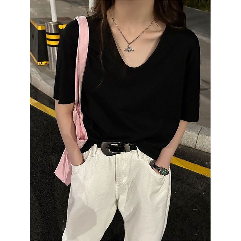 230克冰丝罗纹日系百搭韩版时尚宽松简约纯色v领短袖t恤上衣女潮
