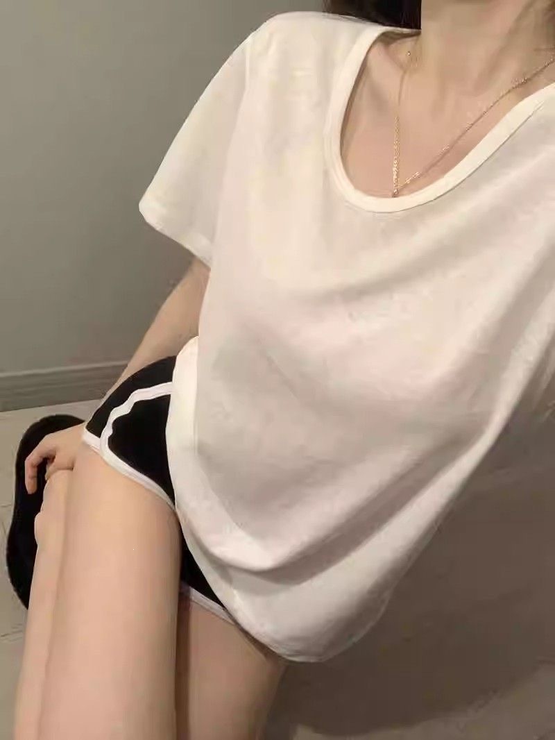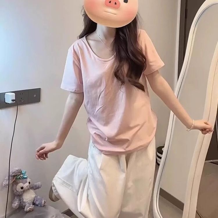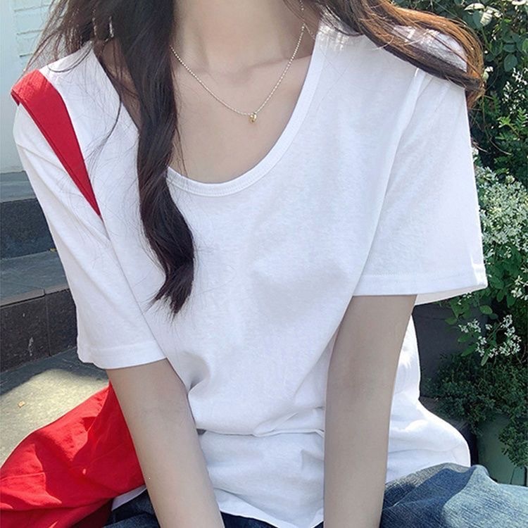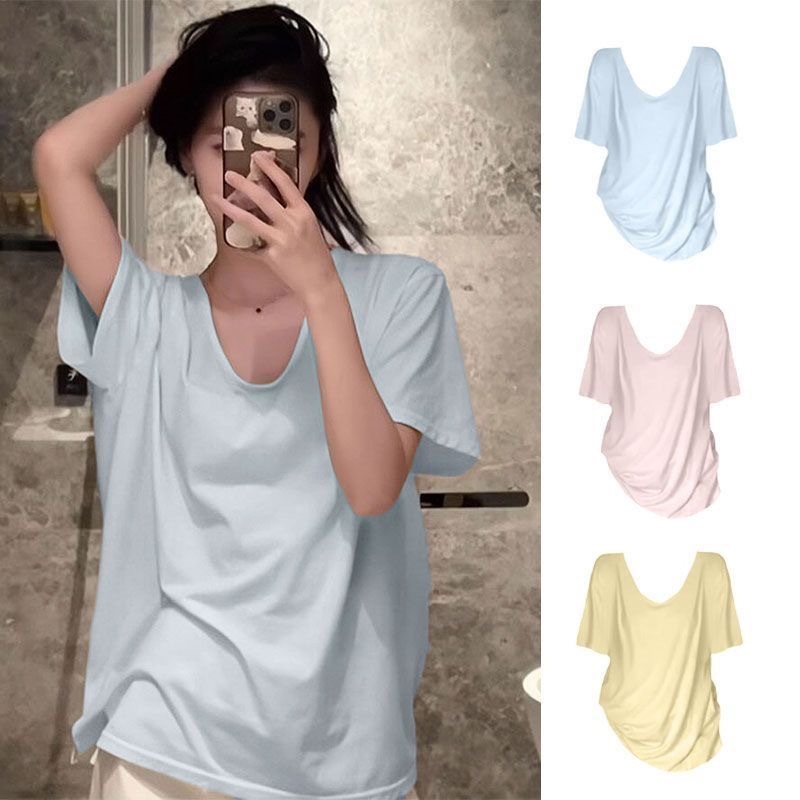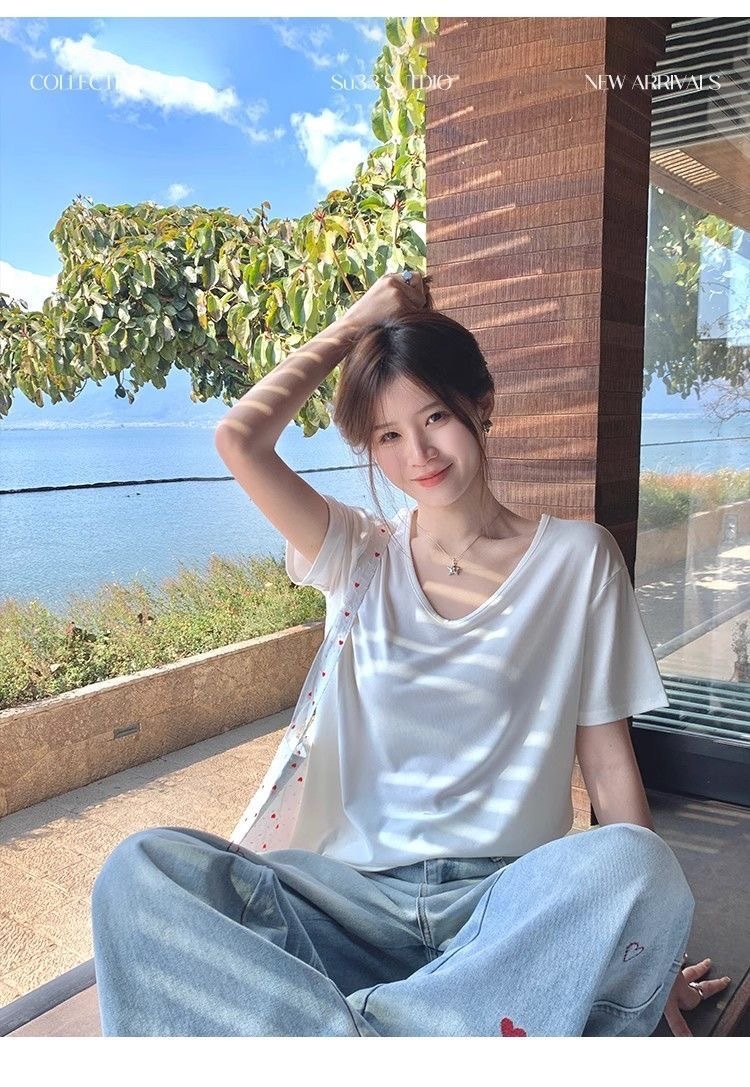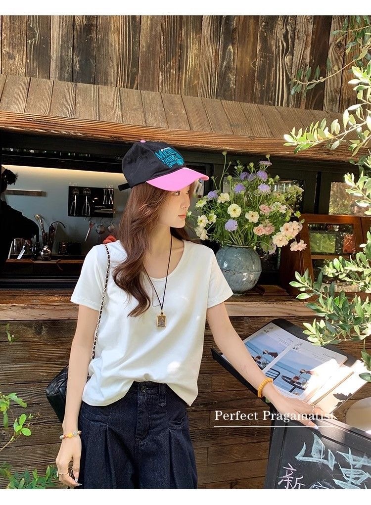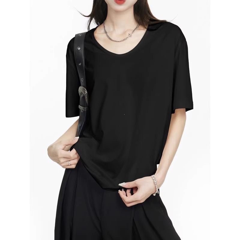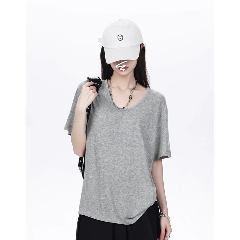 230克冰丝罗纹日系百搭韩版时尚宽松简约纯色v领短袖t恤上衣女潮