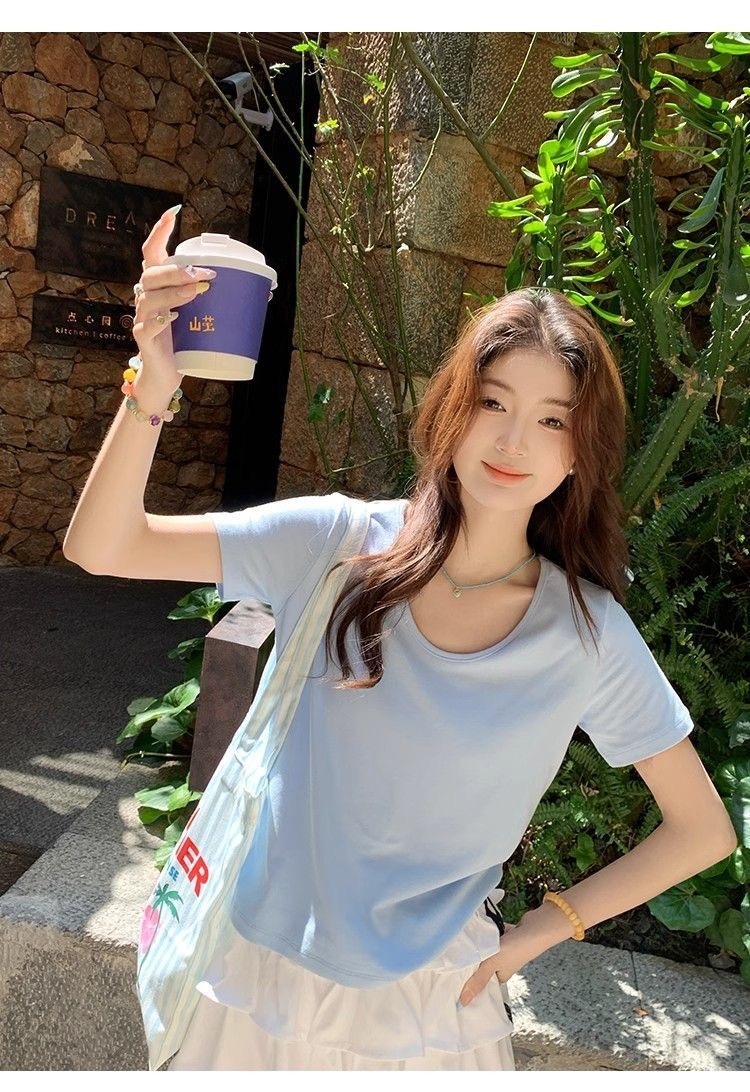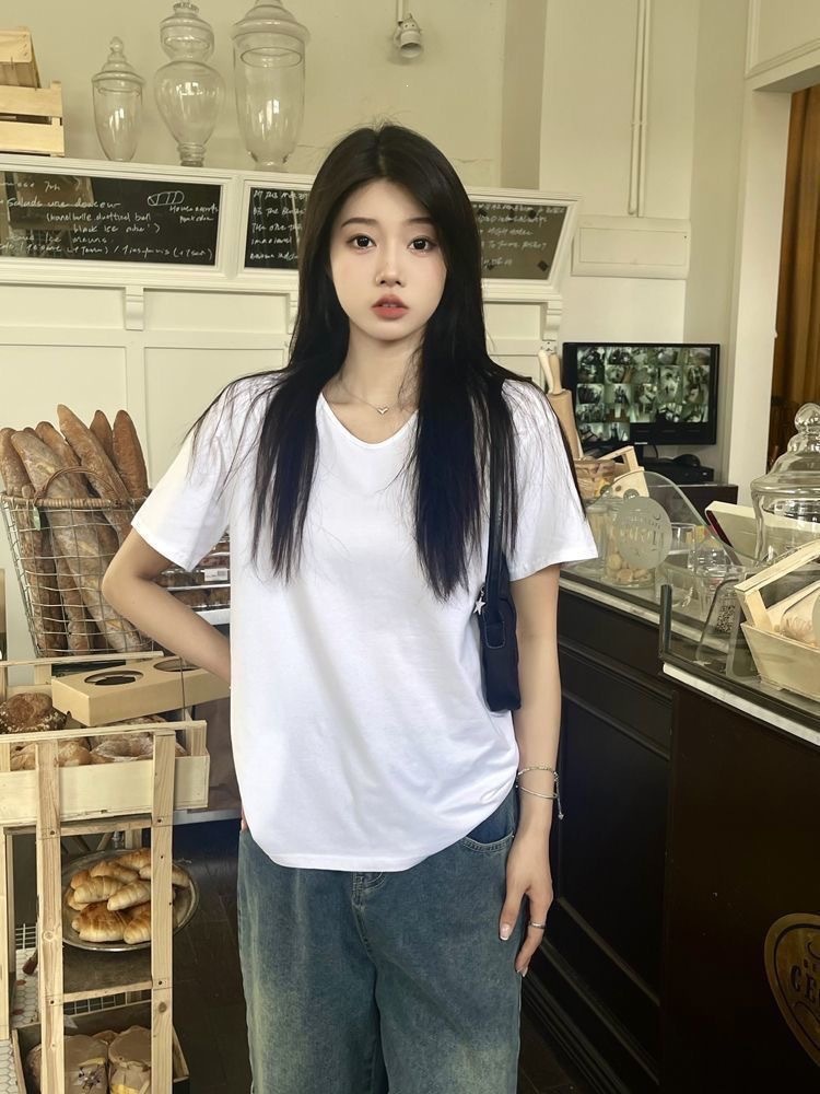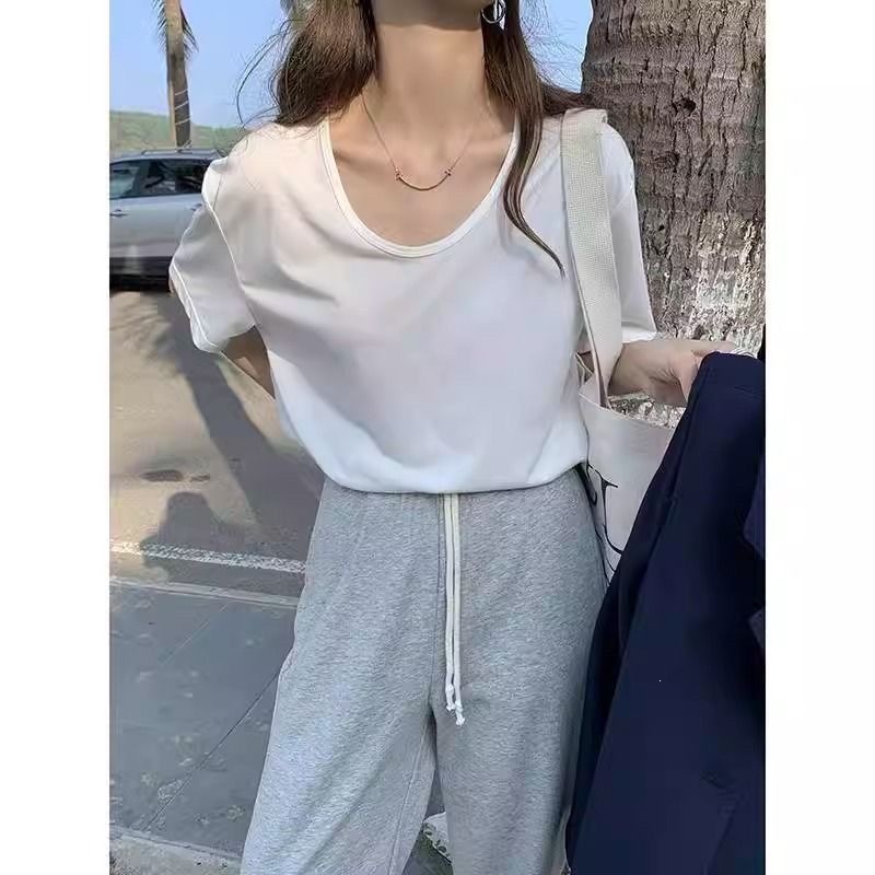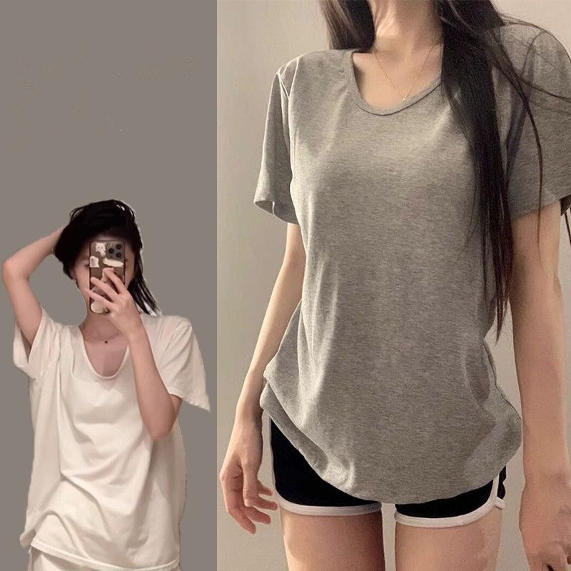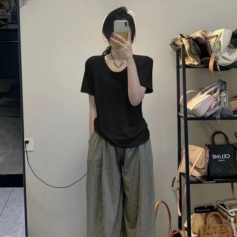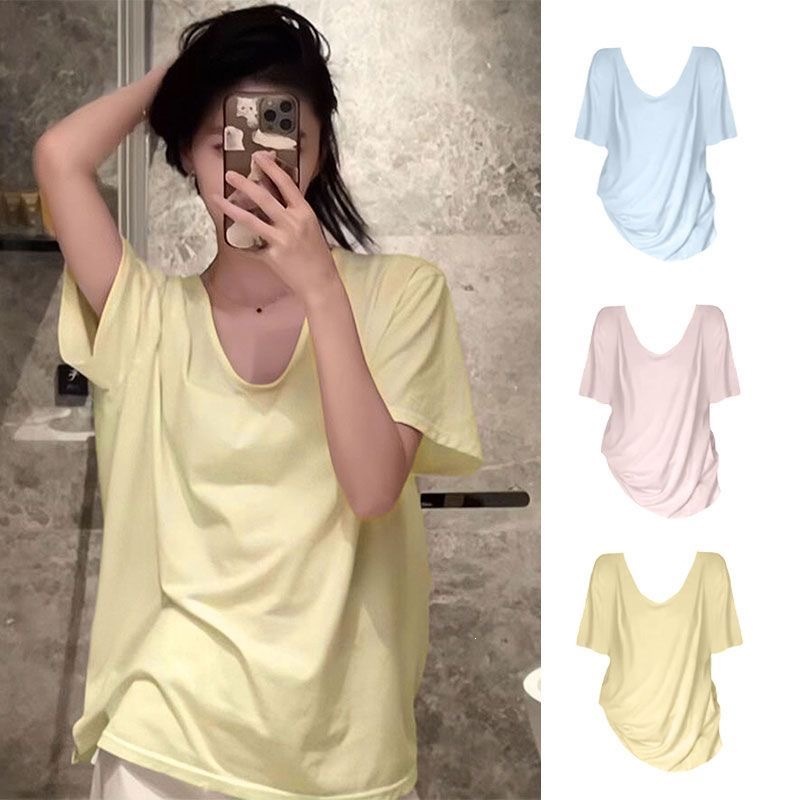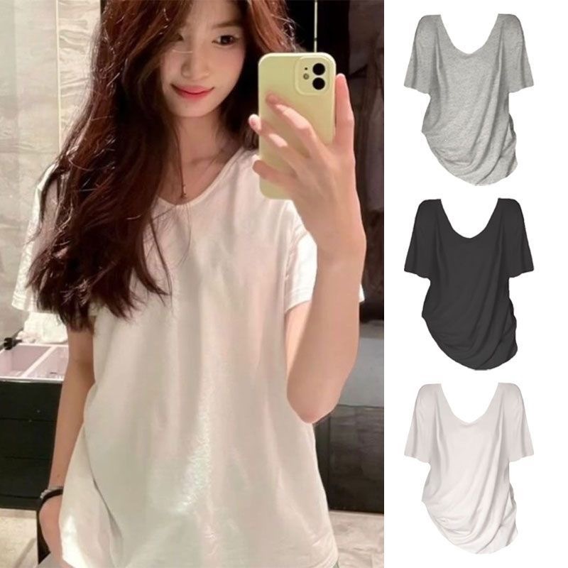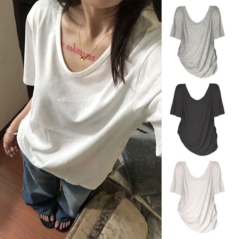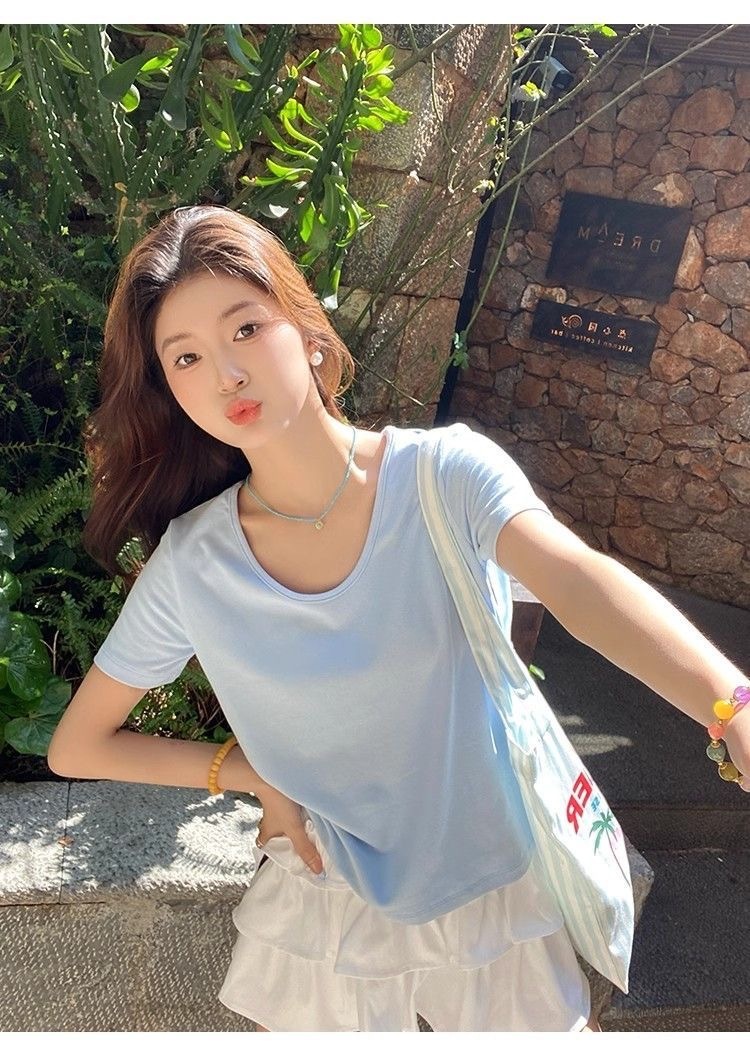230克冰丝罗纹日系百搭韩版时尚宽松简约纯色v领短袖t恤上衣女潮