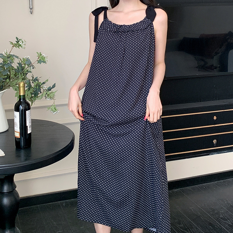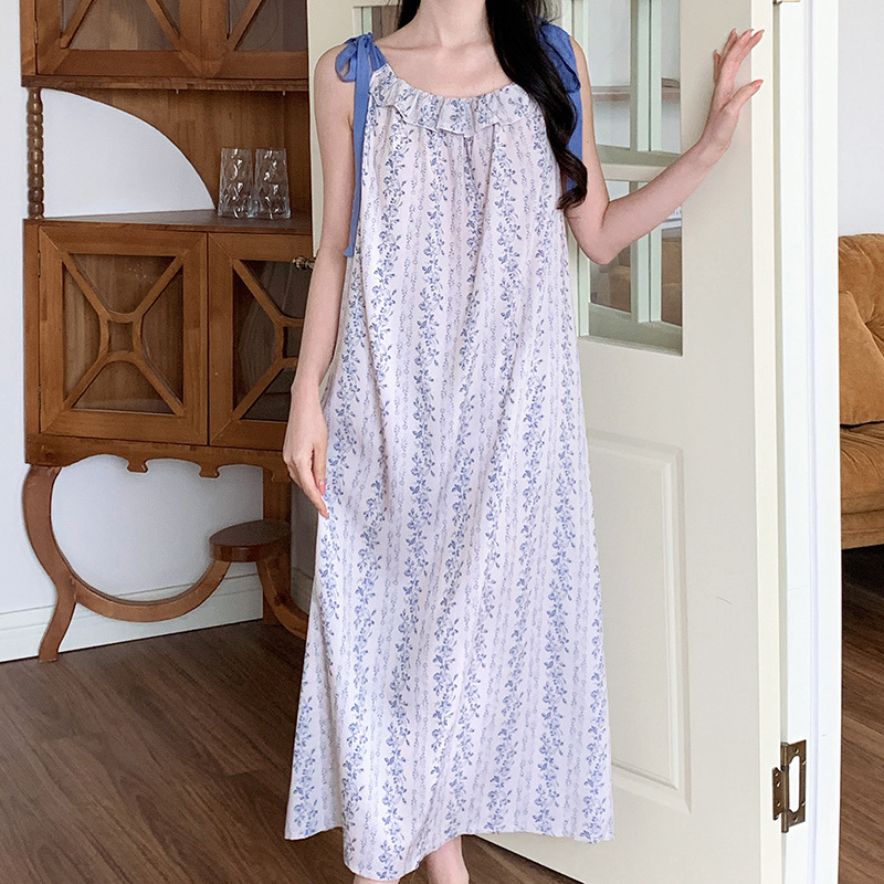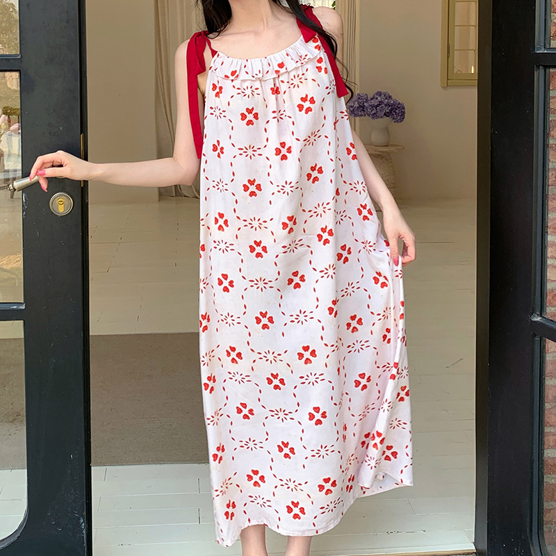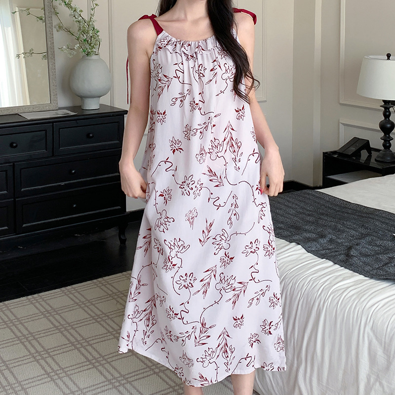 夏季居家慵懒度假风法式长裙睡衣批发新款肩带系绳吊带棉绸睡裙女