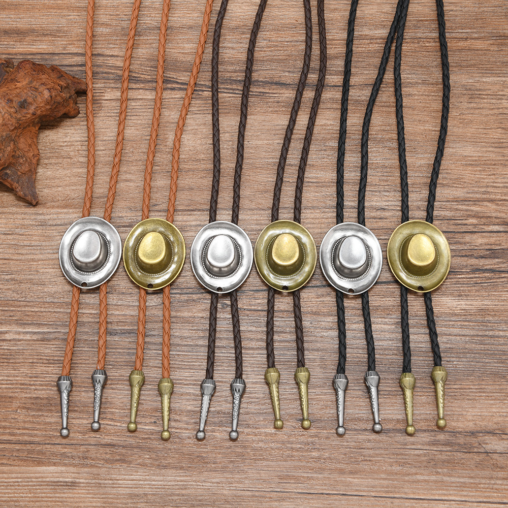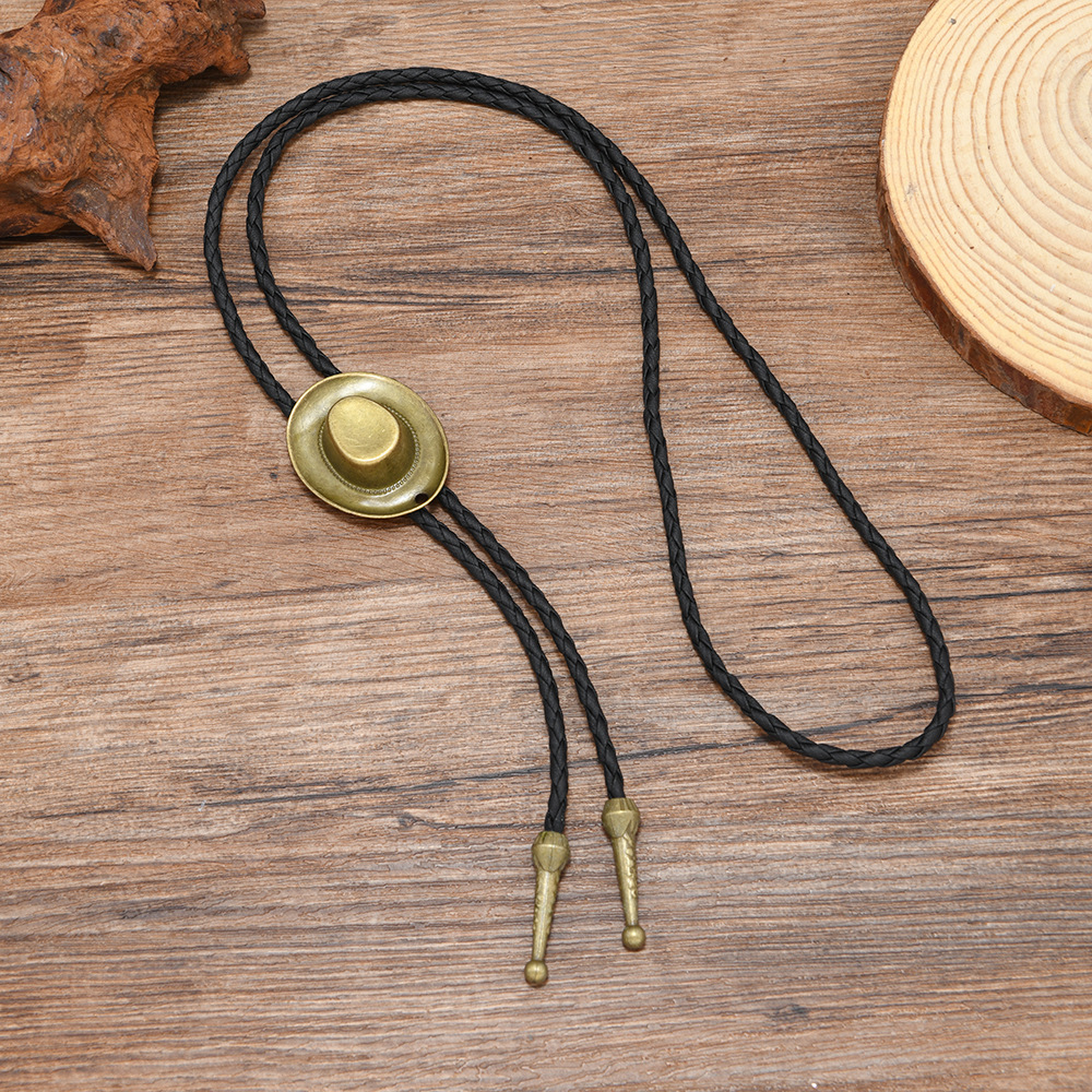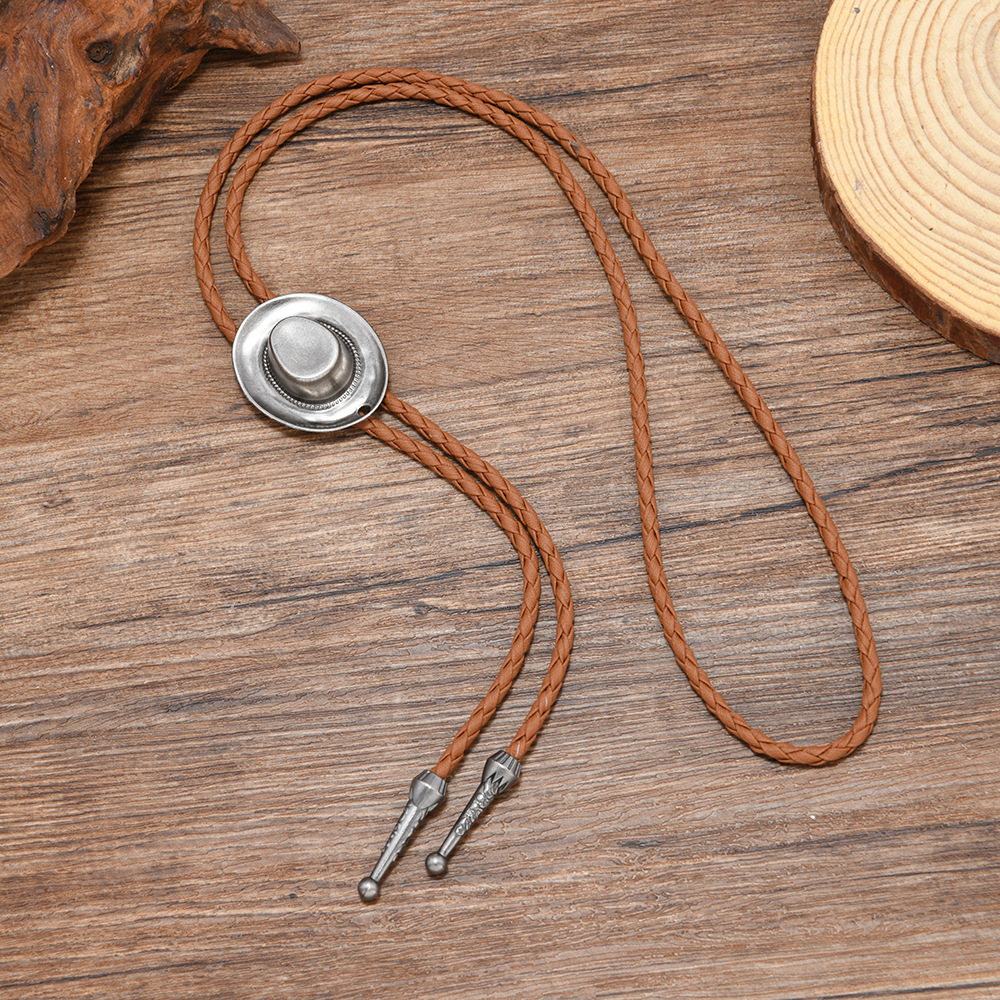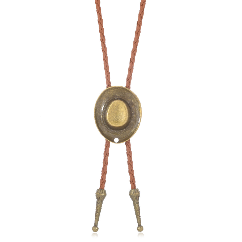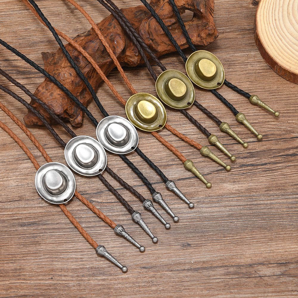 复古西部风波洛领结男女通用编织皮绳项链合金牛仔帽吊坠配饰