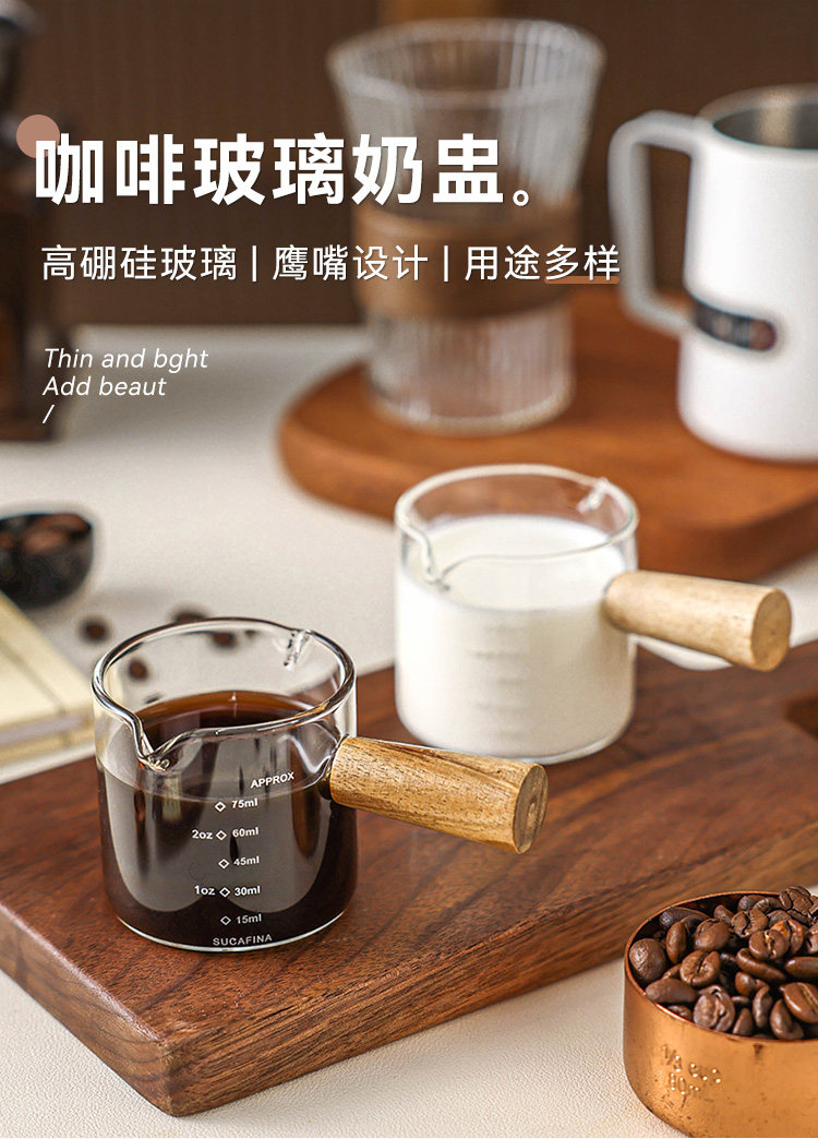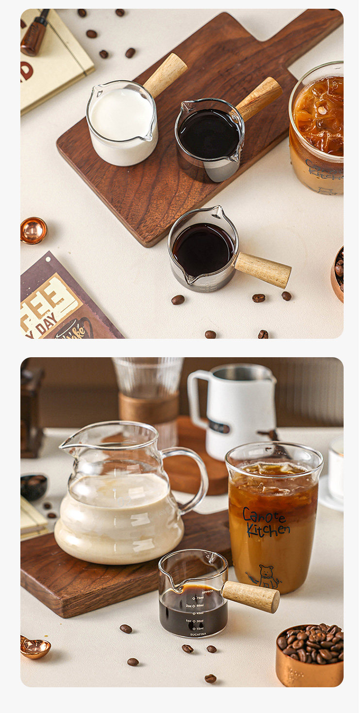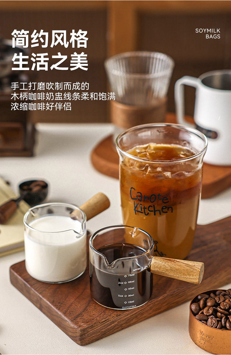 玻璃小奶盅牛奶壶浓缩咖啡刻度量杯西餐厅汁斗蘸料碟木柄小奶罐